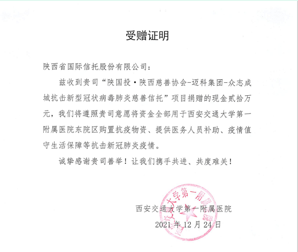 在全市封閉式管理第一天,陜國投當天就完成“陜國投·陜西慈善協(xié)會-邁科集團-眾志成城抗擊新型冠狀病毒肺炎慈善信托”向西安市雁塔區(qū)慈善協(xié)會的首批50萬元資金捐贈,為雁塔區(qū)進行核酸檢測的醫(yī)護人員提供補助。12月24日,該信托向西安交通大學第一附屬醫(yī)院捐贈20萬元,該筆資金緩解了醫(yī)護人員面臨的物資短缺問題,給寒冬中堅守抗疫的醫(yī)護人員帶去溫暖。